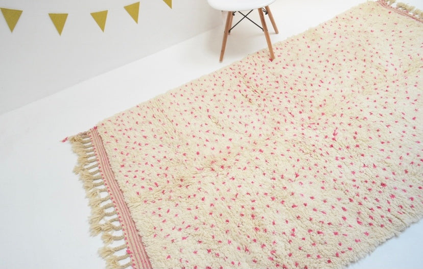 Unique double Knot rug made on hand looms. Soft virgin wool and traditional geometric patterns and shapes form these fabulous rugs. Pale creamy rug layered with fun Pink spots.